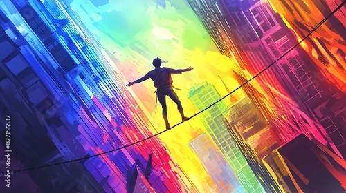city, urban, city landscape, person, human, figure, tightrope, balance, equilibrium, vibrant, colourful, rainbow, colours, spectrum, building, architecture, high, up, up high, sky, cloud, adventure, risk, daring, challenge, hope, freedom, optimism, future, progress, journey, surreal, fantasy, art, illustration, digital, graphic, design, modern, abstract, style, concept, image, picture, photo, view