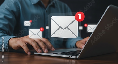 electronic mail, notification, inbox, laptop, computer, digital, technology, communication, cyberspace, message, person, hand, work, business, office, home, productivity, customer service, support, modern, focused, computer user, marketing, commerce, closeup, software, design, desktop, dark background