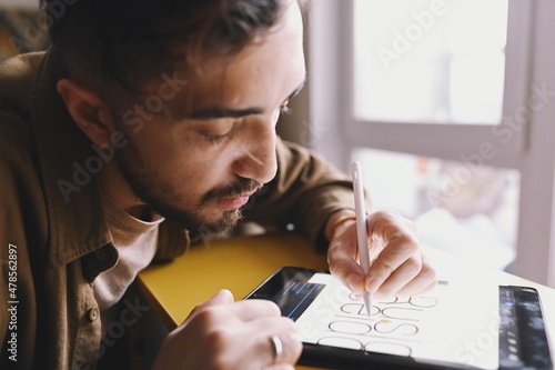 designer, concentration, brooding, businessman, vignetting, person, work, draw, thinks, sitting, desk, computer, photogenic, men at work, job, home, laptop, book, working, casual attire, woman, guy, smile, face, writing