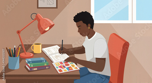 person, drawing, design, desk, window, workspace, art, creativity, indoor, focused, study, home, office, casual attire, colourful, paper, notepad, pen, hot drink, book, chair, lamp, sunlight, illustration, organisation, sketching, youthful, artistic, concentration, hobby, education, living space, bright, modern, contemporary, design, warm, inspiration, ambience, craft, passion, leisure, productivity, engaging, joyful, planning