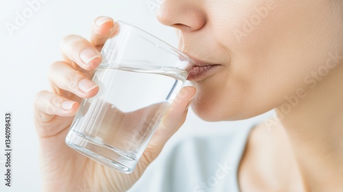 person, drinking, water, closeup, mouth, nose, hand, finger, hydratation, minimalistic, setting, calm, serene, smooth skin, simple