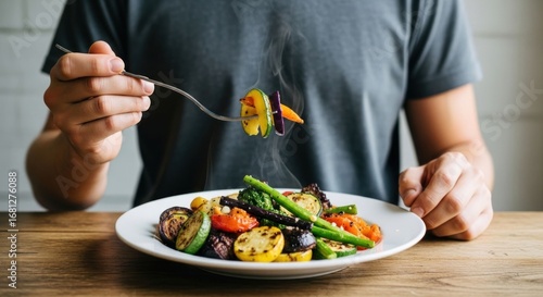 person, eating, vegetable, grilled, fork, plate, food, healthy, meal, delicious, fresh, alimentary, diet, dinner, lunch, hand, steam, hot, closeup, brown, wood, table, organic, colourful, tasty, mixed, courgette, aubergine, broccoli, carrot, bean, tomatoes, seasoned, appetising, savoury, cookery, nourishment