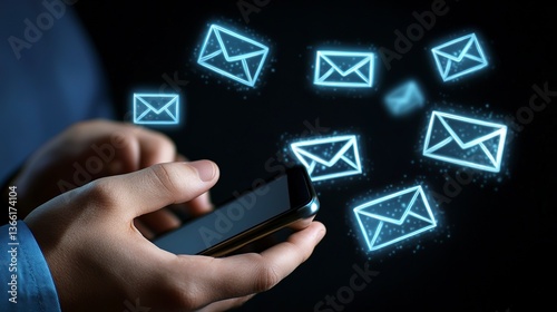 Person engaging in messaging activity on smartphone while surrounded by digital message icons at night