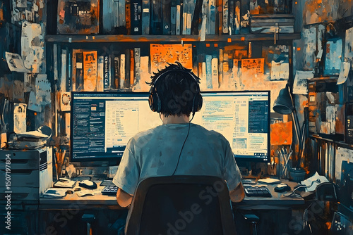 work, computer, programming, room, stylish, cluttered, concentrated, drawing, detail, study, book, person, technology, night, file, creative, light, digital, personal, design, illustration, desk, calm, paper, evening, quiet, passionate, coding, focused, messy, contemporary, earphones, interior, bookshelf