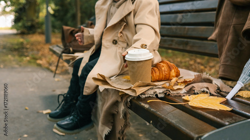 autumn, park, bench, hot drink, croissant, fall, leaf, person, food, drink, outdoors, morning, breakfast, cafes, relaxing, lifestyle, autumn leaf, yellow leaf, brown, beige, warm, cosy, comfort, season, nature, park bench, sitting, enjoying, leisure, weekend, treat, bakery, pastry, delicious, fresh, gold, light, shadow, daylight, urban, city, casual attire, style, fashion, coat, aesthetic