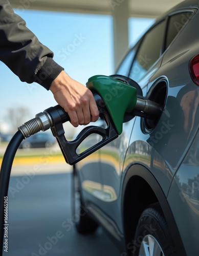 Person fills car with gasoline at modern gas station. Close-up of hand holding fuel nozzle, refueling vehicle tank. Focus on energy, transportation, and cost of automotive fuel.