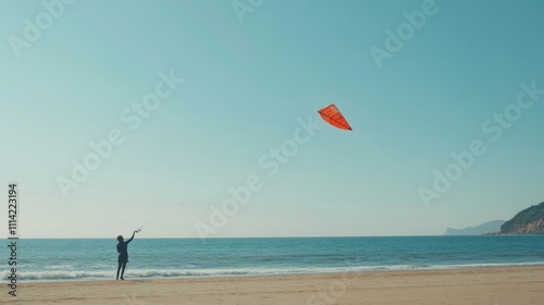 beach, kite, flying, ocean, sand, sky, sea, summer, fun, man, person, nature, leisure, activity, recreation, horizon, coastal, landscape, water, wind, day, sunlight, bright, blue, calm, serene, freedom, happiness, children, playful, enjoyment, vacation, travel, holiday, relax, game, sport, air, vibrant, orange, solitude, silhouette