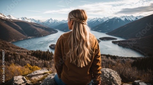 person, breathtaking, mountain, landscape, lake, below, gaze, nature, view, outdoors, scenic, beauty, serene, tranquil, horizon, exploration, adventure, travel, vacation, summer, hiker, holiday maker, destination, discovery, peak, sky, water, majestic, panorama