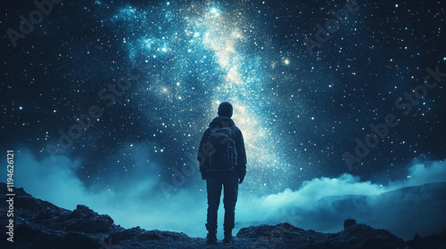 star, galaxy, person, solitude, nature, exploration, universe, calmness, mist, remote, sky, wonder, cosmic, peaceful, night time, adventure, horizon, celestial, beauty, immensity, inspiration, dream, landscape, awe, discovery, imagination, silence, astronomy, observation, connection, backpack, endless, dark, forever, life events, journey