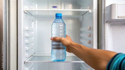 person hand reaching for cold water bottle in refrigerator. refreshing moment captures essence of hydration