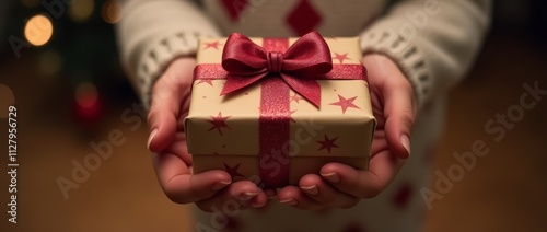 Person holding a beautifully wrapped holiday gift box with a red satin ribbon and star-patterned wrapping paper