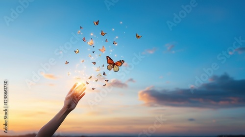 butterfly, person, hand, nature, outdoors, insect, wildlife, environment, holding, air, colourful, gesture, closeup, human, animal, freedom, beauty, tranquil, delicate, moment, life, display, sunlight, greenery, scene, park, wing, finger, emotion, harmony, summer, capture, smile, interaction, peaceful, creativity, exploration, life events, joy, connection, serenity, outstretched, photo, portrait, high-coloured, colours