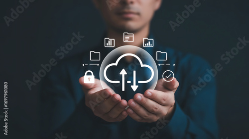 cloud, computing, crystal, ball, datum, transfer, digital, transformation, technology, futuristic, innovation, storage, network, cyberspace, information, icon, symbol, upload, download, security, lock, connection, communication, business, concept, abstract, background, person, hand, holding, future, service, online, global, software