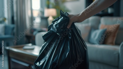 garbage, bag, hand, hold, plastic, household, waste, trash, interior, room, home, living, clean, tidy, furniture, couch, sofa, cushion, throw, dispose, cleaning, house, day, indoor, light, person, human, woman, adult, closeup, shot, front, view, grey, black, brown
