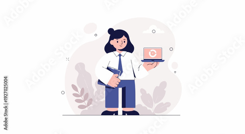 person, holding, laptop, book, abstract, shape, plant, flat, illustration, white, background, blue, pant, shirt, attaching, dark, hair, bun, pink, cheek, happy, smiling, business, professional, work, office, technology, digital, datum, information, learning, education, cognition, modern, creative, design, vector, graphic, clean, simple, organised, communication, connection, progress, idea, strategy, planning, management, executive