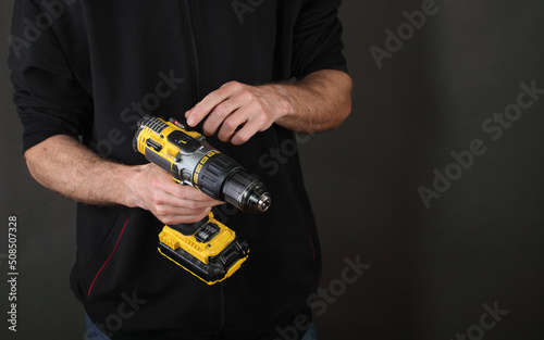 screwdriver, yellow, person, hold, replace, tip, grey background, tool, cordless
