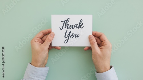 thank, you, card, hand, holding, gratitude, appreciation, message, note, white, pastel, green, background, minimal, paper, giving, kindness, support, gesture, communication, expression, text, writing, script, font, typography, simplicity, elegant, formal, clean, surface, view, studio, person, presenting, offering, isolated, positive, sentiment, business, human relationships, emotion, graphic, design, display, love, care
