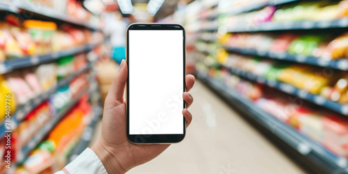 Person holding and showing white mobile phone with blank black desktop mockup image screen in supermarket mall with food shelves of beer on background