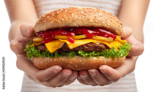 person, holding, cheeseburger, large, juicy, lettuce, tomatoes, ketchup, cheddar, cheese, bun, fast food, food, meal, lunch, snack, sandwich, delicious, fresh, meaty, colourful, vibrant, mouth-watering, beef, dining, tasty, popular, quick, treat, comfort food, eatery, unhealthy, greasy, classic, fast food, lifestyle, dining room, kitchen, casual attire, lunch break, mealtime, junk food