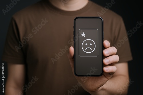 Person Holding Smartphone Displaying Sad Face and Star Rating Icon on Screen.