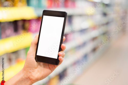 Person holding smartphone in supermarket