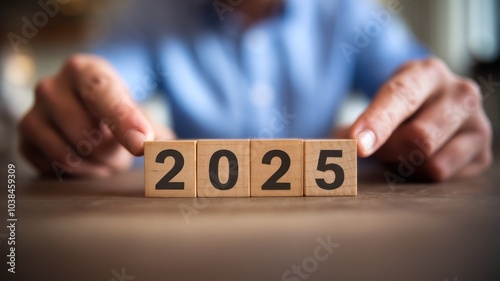 Person holding wooden blocks with number 2025, focus on planning and future.