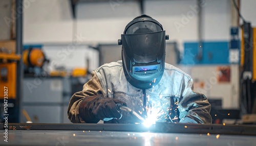 Person in protective gear welding metal, sparks flying. Workshop background, focus on the action of the skilled worker