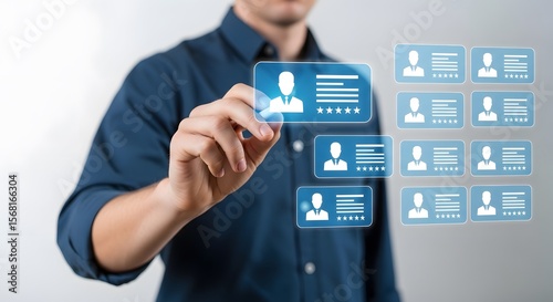 Person interacts with virtual job applicant profiles for human resources talent acquisition and recruitment applications.