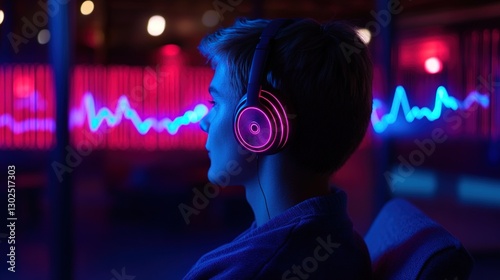 person, listening, music, earphones, neon, light, room, night, young, profile, audio, sound, entertainment, relaxation, sharpened, technology, colourful, nightlife, club, design, contemporary, modern, audiophile, soundwaves, optical, life events, vibrant, passion, attention, enjoyment, concert, party, digital, virtual, rave, chill, creative