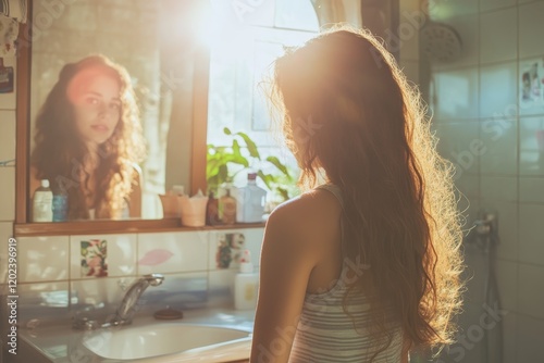 person, mirror, skincare, vanity, bathroom, sunlight, hygiene, sunlit, morning, woman, hair, sink, through, serene, portrait, light, window, glow, natural, aethereal, bright, dreamy, laundered, curly, look, domestic, streaming, relaxation, soft, lifestyle, faucet, back, illuminated, peaceful, calm, hazy, warm, tranquil, glasses, gentle, indoor, shoulder, casual attire, clean, wavy, interior, ceramic, female