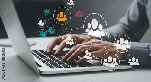 network, connection, laptop, computer, technology, digital, online, cyberspace, communication, connectivity, social network, networking, people, person, human, hand, typing, keyboard, screen, interface, user, business, work, office, professional, employee, team, collaboration, management, datum, information, global, earth, connection, link, node, graph, diagram, innovation, modern, future, progress, growth, development, strategy, planning