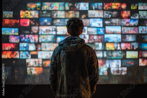 Person observes a vibrant digital display full of visual art in a creative space during the evening