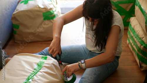 Person packing boxes. Concept moving house. Woman packing her stuff into the boxes using an adhesive tape while moving to new apartment