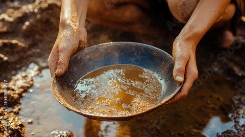 person, hand, water, pan, dirt, nature, mining, gold, river, mineral, dirtied, environment, exploration, hobby, sifting, sediment, sun, muddy, excitement, adventure, tool, childhood, earth, rural, labor, activity, background, clear, spring, scene, individuality, skill, wealth, resource, industry, tradition, heritage, discovery, fun, tour tourism, culture, landscape, natural, filtering, textural