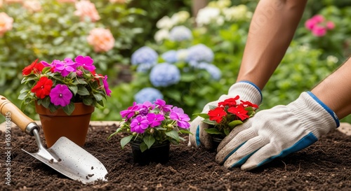Person planting colorful flowers with gloves amidst greenery and a gardening trowel