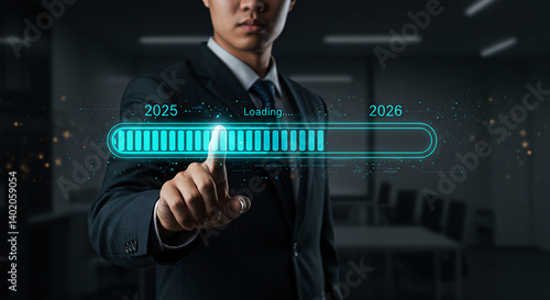 Person pointing to digital loading bar from 2025 to 2026, symbolizing progress, planning, and new business year transition