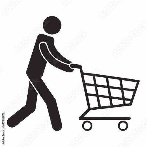 shopping cart, shopping, cart, supermarket, grocery, store, retail, consumer, client, purchase, buy, sell, market, icon, symbol, pictogram, graphic, design, simple, minimalist, black, white, silhouette, person, people, man, human, figure, walking, pushing, vector, illustration, isolated, background, transparent, clip art, element, signs, commerce, business, shopping centre, online shopping, e-business, streetcar, basket, good, product, consumerism