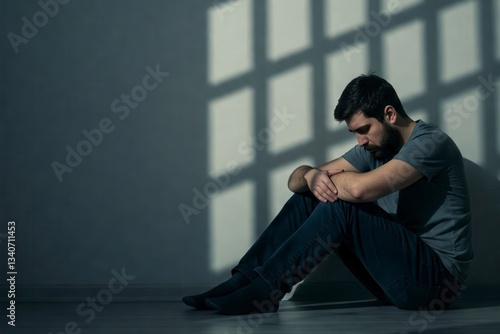 person, sitting, floor, shadow, bar, mental, barrier, anxiety, depression, empty, space, symbolic, emotional, distress, isolation, confinement, psychological, struggle, invisible, light, dark, silhouette, mood, feeling, vulnerability, human, condition, representation, concept, art, conceptual, state, atmosphere, interior, minimalist, loneliness, sorrowful, introspection, personal, health, design