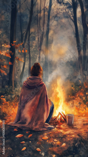 autumn, watercolor, campfire, person, forest, fall, leaf, warm, outdoors, peaceful, nature, cosy, solitude, no people, wood, fire, calmness, rustic, seasonal, artistic, serene, autumn color, calm, scenic, contemplation, adventure, camping, warmth, autumn, wilderness, october, relaxation, scenic view, quiet