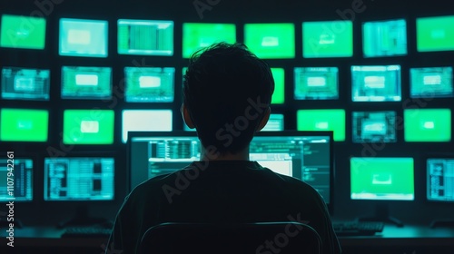 Person sitting in front of multiple computer screens, immersed in a technological environment, analyzing data.