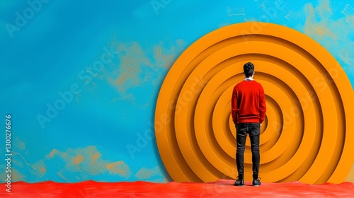 person, standing, colourful, abstract, circle, design, wall, art, shape, orange, blue, red, fashion, creativity, inspiration, modern, youth, individuality, style, contemporary, contrast, texture, geometric, silhouette, scenery, environment, playful, visual, expression, expressionism, bold, line, aesthetic, lifestyle, imagination, urban, casual attire, appearance, serene, simplicity