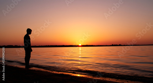 person, standing, silhouette, beach, watching, ocean, sunset, water, shoreline, sand, wave, sky, orange, glow, horizon, coastline, dusk, evening, seascape, scenery, nature, tranquil, peaceful, calm, travel, relaxation, day, sun, scene, seacoast, contemplation, quiet, serene
