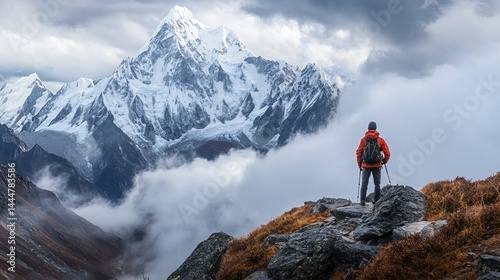 person, mountain, snowy, peak, view, nature, landscape, climb, summit, sky, adventure, exploration, outdoors, freedom, scenery, hiking, travel, beauty, wild, serenity, landform, panorama, height, journey