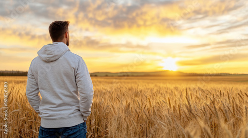 person, field, sunrise, gold, nature, landscape, calmness, wheat, sky, cloud, horizon, outdoors, male, casual attire, contemplation, beauty, warm, sunlight, rural, peaceful, scenery, agriculture, summer, solitude, environment, growth, freedom, calm, exploration, adventure