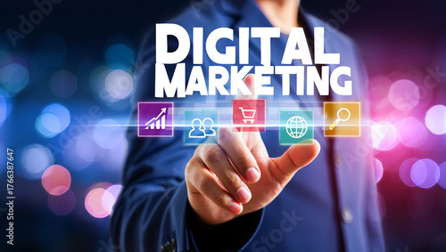 person, hand, touching, screen, digital, marketing, icon, graph, people, cart, globe, search, technology, business, abstract, background, light, bokeh, blue, purple, pink, modern, concept, interface, interactive