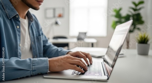 person, typing, laptop, computer, hand, keyboard, technology, work, office, modern, bright, indoor, desk, white, denim, shirt, casual attire, sharpened, screen, business, communication, digital, online, remote, concentration, workspace, indoor plant, home office, professional, male, user, data entry, information, cyberspace, web, software, productivity, closeup, soft light, minimal