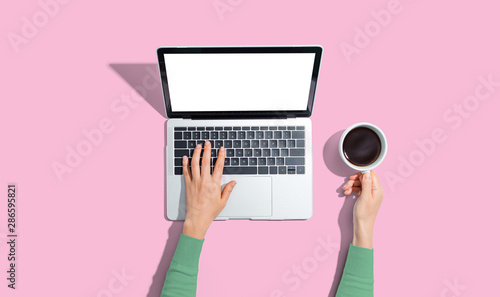 laptop, computer, technology, hot drink, hand, screen, office, tech, table, desk, business, working, up high, keyboard, financial, finance, account, accounting, concept, flat, lay, person, people, woman, simple, simplicity, overhead, top, view, copy space, copy, pink, pastel, space
