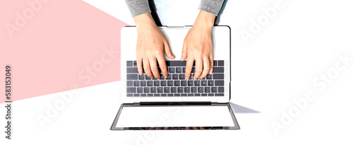 laptop, computer, technology, business, financial, marketing, finance, remote, work, job, home, distance, telework, meeting, accounting, account, online, shopping, research, office, tech, table, desk, working, concept, notebook, hand, woman, digital, flat, lay, minimal, simplicity, up high, overhead, view, top, background, shadow, white, pink, triangle, cleaving, tone