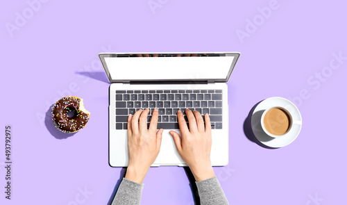 laptop, computer, technology, donut, donut, business, financial, marketing, finance, accounting, account, online, shopping, learning, study, office, tech, design, table, desk, working, keyboard, concept, notebook, digital, woman, minimal, simplicity, up high, overhead, view, top, background, hot drink, cup, donut, dessert, purple