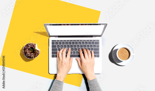 laptop, computer, technology, donut, donut, business, financial, marketing, finance, accounting, account, online, shopping, learning, study, office, tech, design, table, desk, working, keyboard, concept, notebook, digital, woman, minimal, simplicity, up high, overhead, view, top, background, hot drink, cup, donut, dessert, white, yellow, cleaving, tone